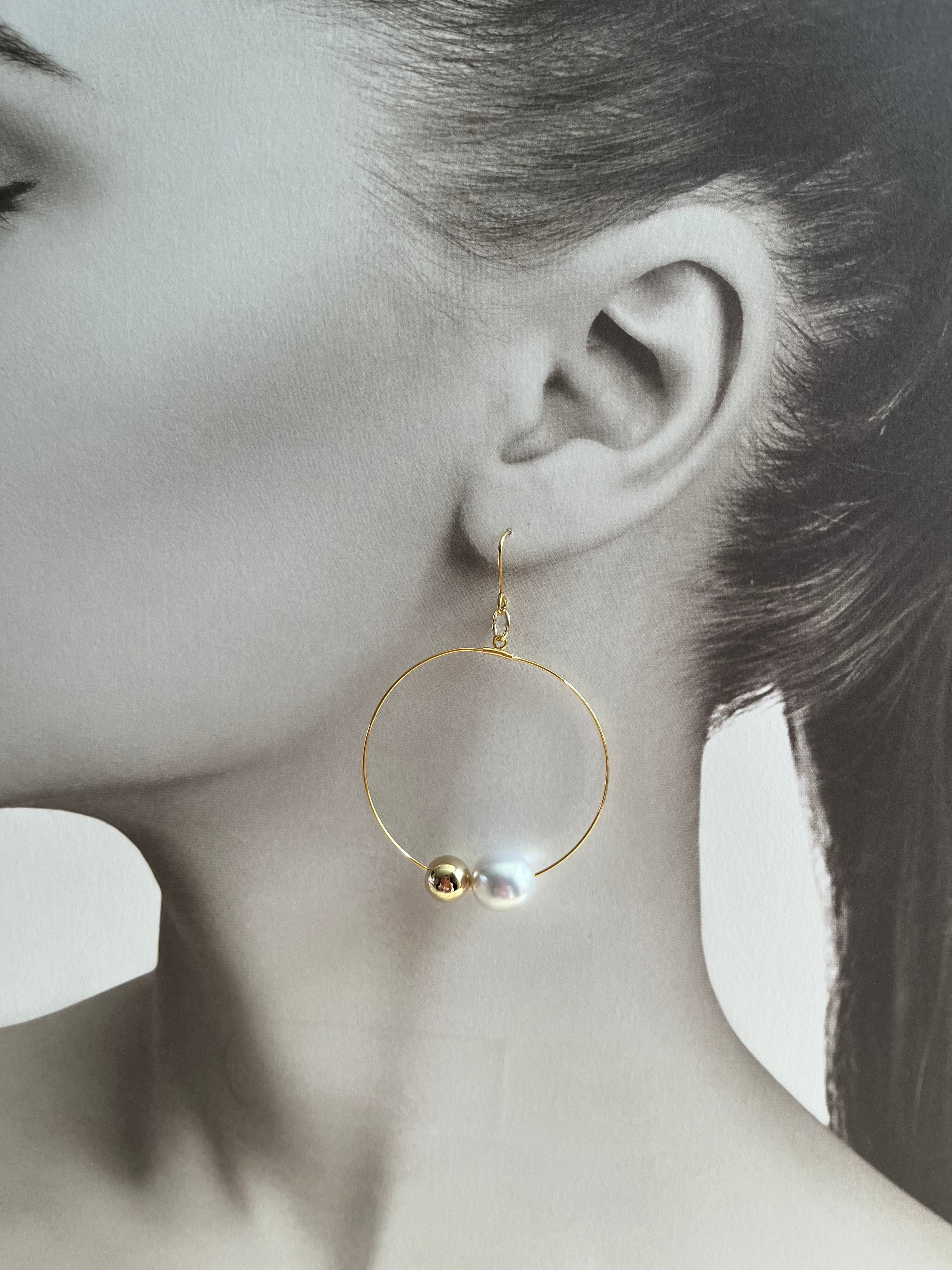 バロックパールとメタルボールのフープピアス.イヤリングは、エレガントで華やかなデザインが特徴です。キラキラとした揺れ感が日常のさりげないアクセントに、ぜひお試しください。